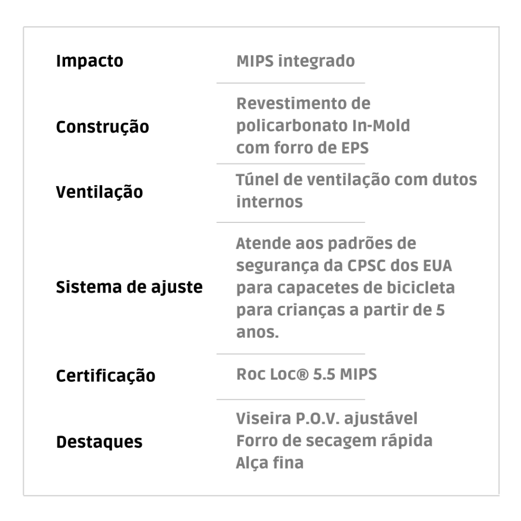 O CAPACETE ENVOY FOI PROJETADO PARA O AVENTUREIRO EXPERIENTE QUE APRECIA UM AJUSTE CONFORTÁVEL, SEM SOL NOS OLHOS E COM MUITA VENTILAÇÃO. O sistema E-LOC 5.5 MIPS altamente ajustável permite que seja feita a personalização do ajuste e da sensação para melhorar a estabilidade e o conforto a longo prazo, ao mesmo tempo em que oferece uma medida extra de proteção contra forças rotacionais no caso de um impacto em determinada posição. A viseira P.O.V. oferece 15 graus de ajuste, e o resistente revestimento externo de policarbonato é permanentemente fundido ao funda de espuma EPS por meio de nosso processo de construção Supra-Mold™ para maior durabilidade e ventilação sem aumento excessivo de volume.